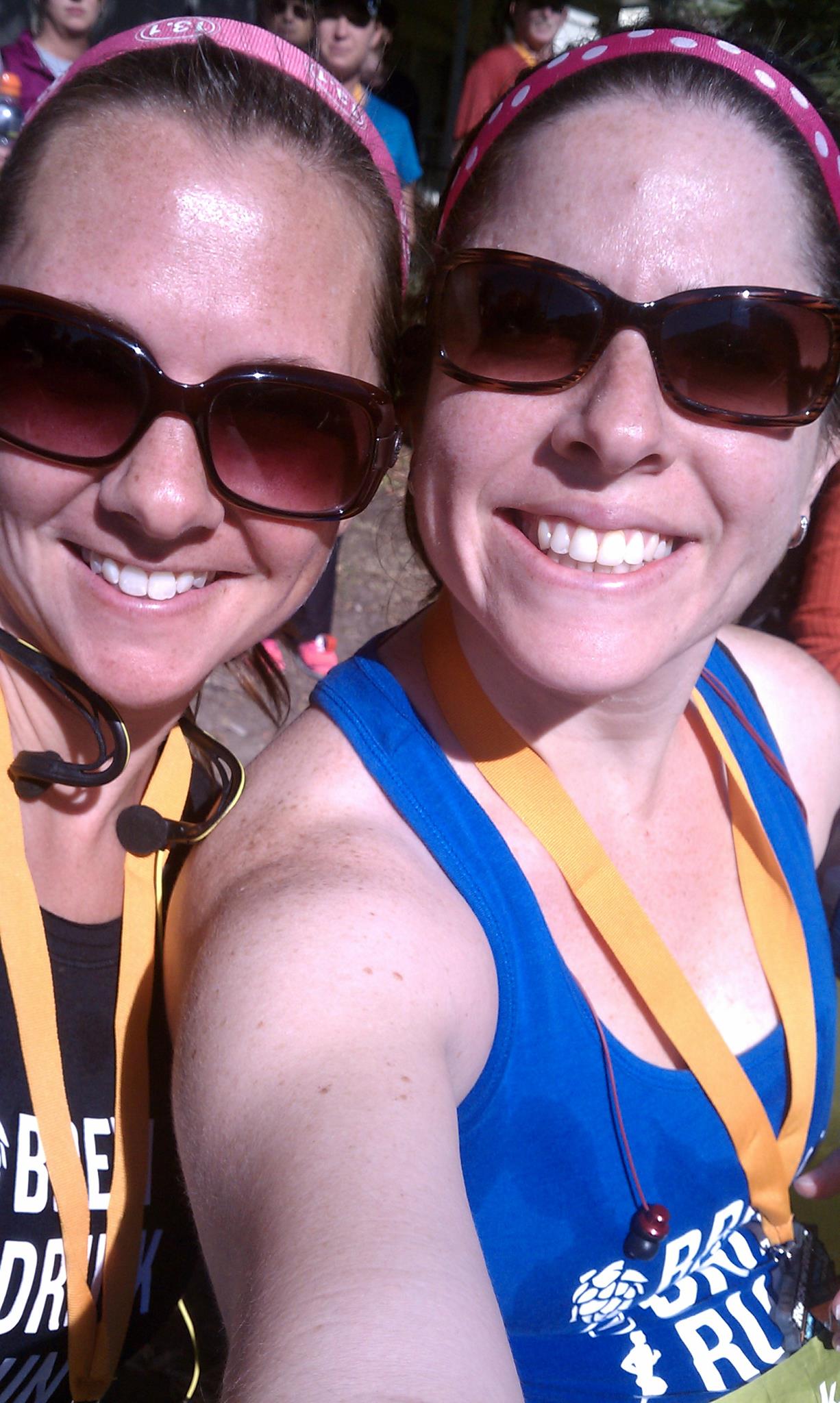 • Andrew and Ginger. They are such fantastic running buddies and coaches. It was comforting to go through all the same pre-race, race and post-race feelings together. I didn’t get to run with Ginger the whole time but we started together and finished together – something that made the race so perfect for me. We stood side-by-side in the shoulder-to-shoulder crowd in Corral 17 as we waited in anticipation for them to set us free. We had to say goodbye to Andrew because he was all the way up in front of the thousands in Corral 4 for his first marathon. (He did amazing and I’m so proud of him for accomplishing it. When he sets his mind to something …) When it was our turn, we did our thing. I knew I wanted to keep my pace nice and easy so I held back from trying to stay with her pace. Twelve miles – and almost finished – later, I saw my friend. I kept looking for her pink skirt and her Brew/Drink/Run shirt and was so happy to see her. “My friend! My friend!” I shouted. We finished together – same time – same pace. We joke that we should’ve stopped at the finish line and said, “No, you go first. No, you.”
