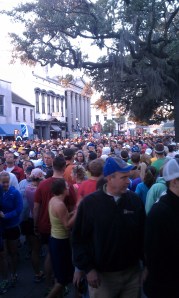 • The people were lovely. So many came out to cheer on the runners. Their clever signs along the route – “You think running a marathon is hard, try waiting for you to finish.” “Don’t poop yourself!” “Run, Total Stranger, Run!” “Worst Parade Ever!” “If running was easy it would be called your mom!” – dotted my breathing with giggles and served as entertaining billboards. How could I pass up the small children who held out their hands for a high-five? Neighbors eating their breakfasts and even enjoying mimosas on their front lawns as they tailgated and relaxed as thousands of people passed by their homes. (One house even offered free margaritas!) Sanitation workers lined up and waiting to roll out offered high-fives and words of encouragement. That almost brought the first hint of water to my eyes. It really happened when I passed two neighbors sitting comfortably on their front porches. One was an older woman who greeted us with a kind smile and wave. “Good morning! Good morning!” she sang in such perfect Savannah style. Beautiful.