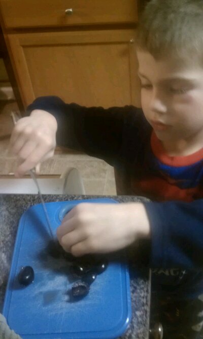Cutting olives for his sandwich.