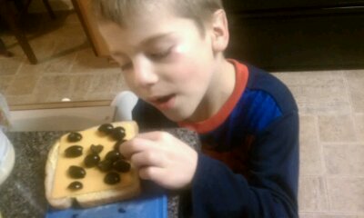 I think he most enjoyed helping with his school lunch. We made ham, cheese, mayo and mustard on whole grain with some olives he wanted to cut himself. The lunch also featured a side of giggles as he kept putting the silliest things in his lunchbox to then declare, “It’s all ready!”