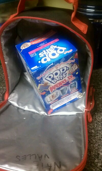 Chicken Broth for lunch. This replaced a bag of marshmallows he just had in there. Sweet, silly boy.
