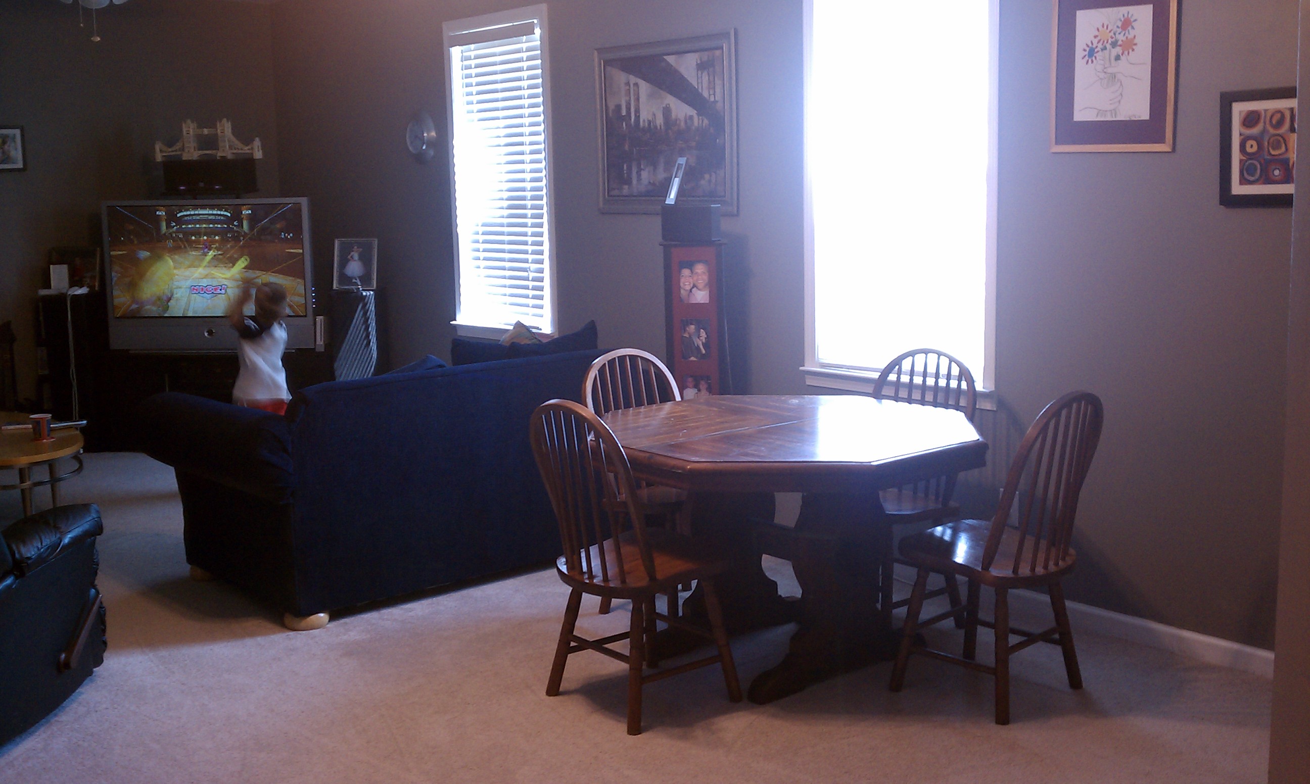 I have high hopes of refinishing it and then having it for a game/puzzle table. Eventually, when the next age group of “toys” replace the ones that live in our family room now, we will have a bar and finally hang my stained glass poker-table light that I’ve had for years to spice it up some.