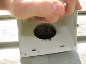 He then climbs 20 feet up, armed with a flashlight in his mouth and a can a wasp killer in his hand. (It was 9:30 pm.) The rest is picture history.